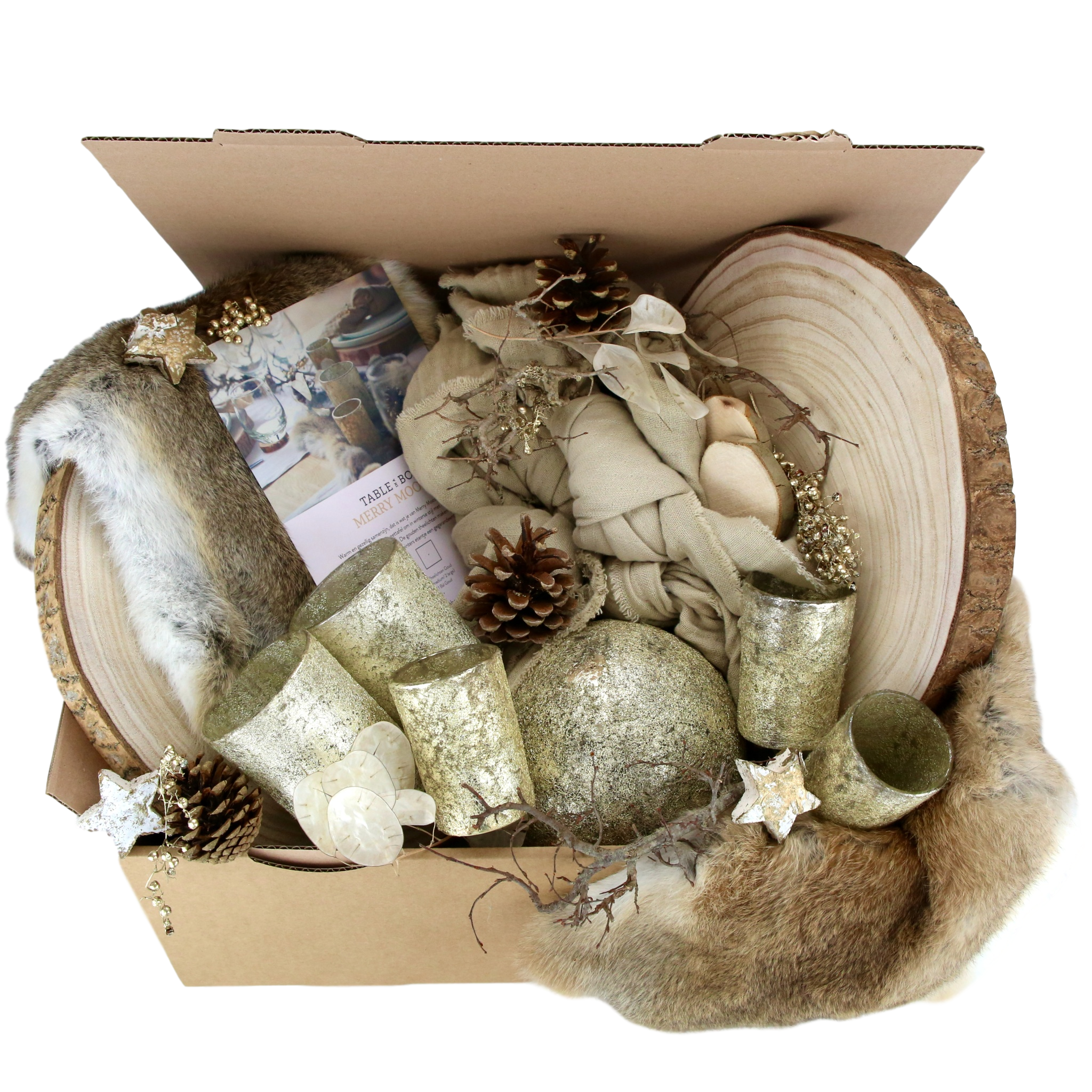 De box zit vol met zorgvuldig uitgekozen elementen en materialen. In een box voor 6 personen kan je volgende zaken vinden: